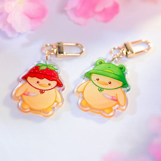 Kawaii Bird Duck with Knife and Frog or Strawberry Hat Keychain